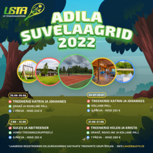 Adila Suvelaagrid 2022 03.05.2022 Ülipopulaarsed Adila Suvelaagrid toimuvad ka sel suvel!! Laagreid viivad läbi meie Tondi ja Viimsi treenerid. Laagritesse ootame USTA õpilasi. Veel on jäänud viimased kohad, registreerida saab SIIN!