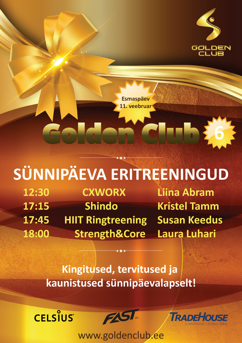 05.02.20196 aastat tagasi avasime suurejooneliselt Golden Club fitnessklubi Tondil. 11. veebruaril on põhjust tähistamiseks! Selleks oleme treeningplaani lisanud mitmed eritreeningud ning rõõmustame klubiliikmeid väikeste sünnipäevaüllatustega! Palju õnne!