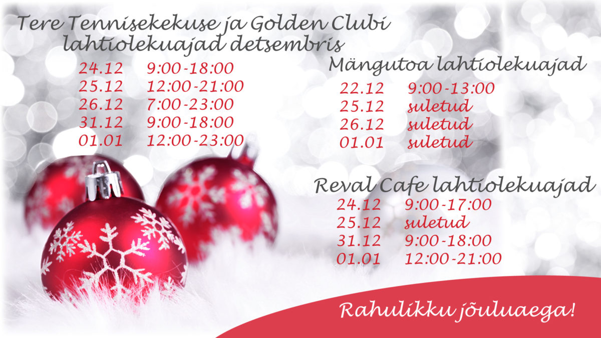 21.12.2017Golden Club ei jäta oma liikmeid pühadeperioodil hätta, vaid kutsub ikka treeningutele! Jõusaal on avatud kõikidel päevadel, rühmatreeningutes saab osaleda järgmistel aegadel: