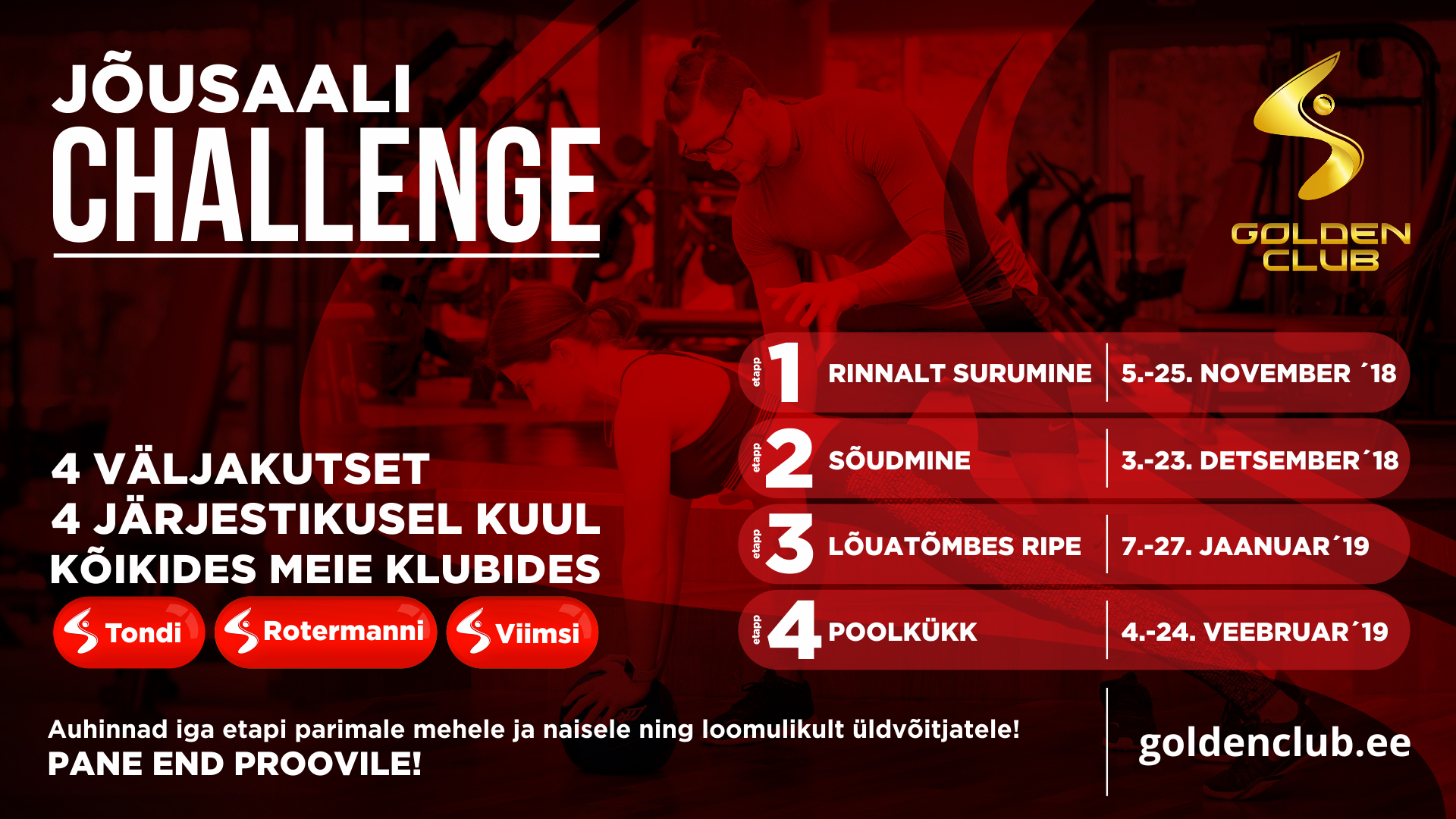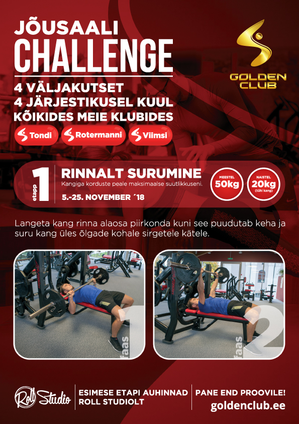 19.11.2018Oleme startinud 4-kuulise Jõusaali Challenge programmiga! Alates novembrist on igal kuul võimalik end proovile panna uuel etapil igas Golden Club klubis. Parim naine ja parim mees selgitatakse välja klubipõhiselt.