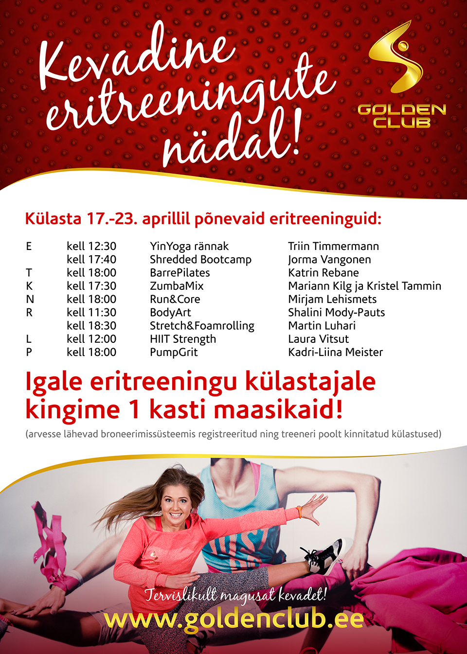 11.04.201717.-23. aprillil toimub Golden Clubis eritreeningute nädal! Iga eritreeningus osaleja saab kingituseks kasti kevadisi maasikaid!