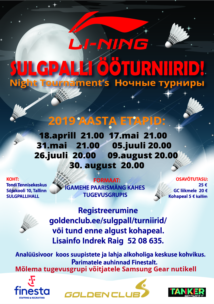 11.03.201918. aprillil algusega kell 21.00 stardib ööturniiride sari sulgpalluritele – Li-Ning ööturniir. Käesolevasse hooaega on planeeritud 7 etappi.