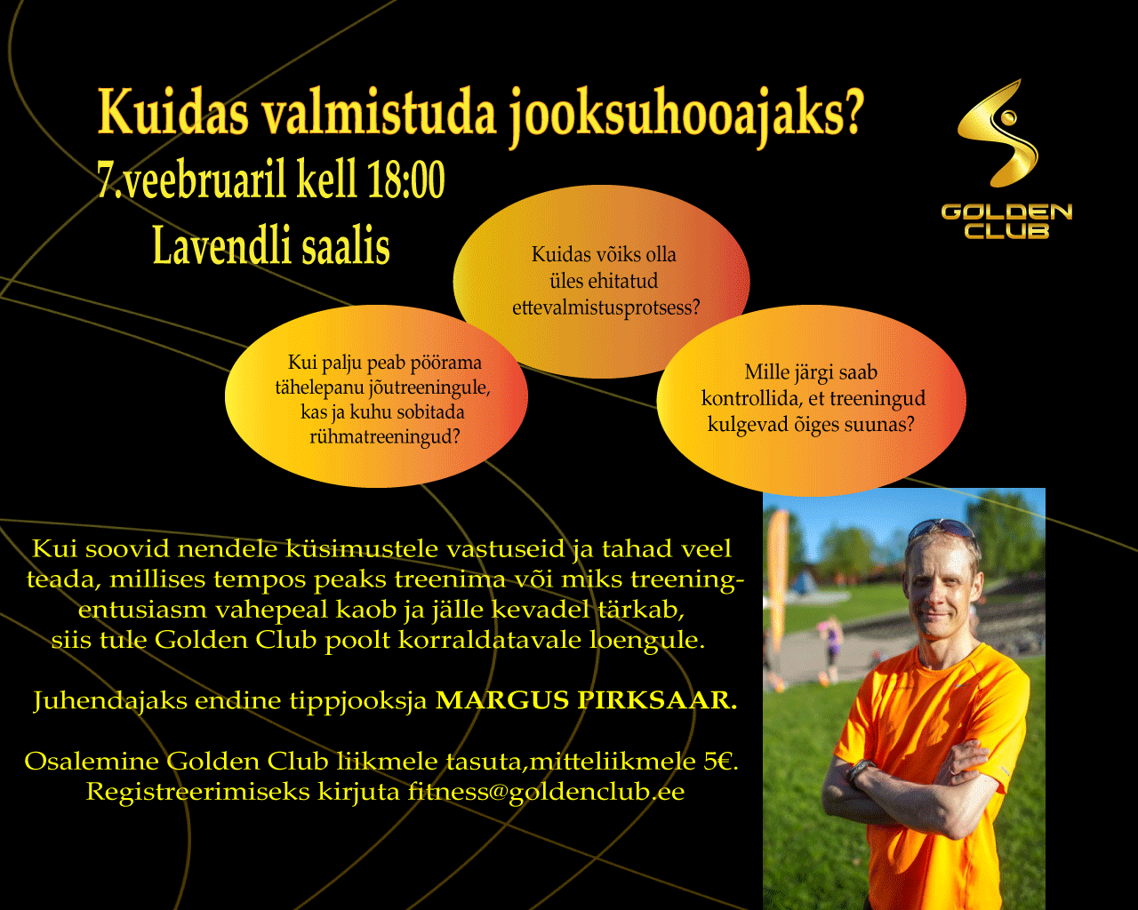 Loeng toimub Lavendli saalis. Golden Club fitnessi liikmele osalemine tasuta, huvilisele väljastpoolt 5€. Registreerimiseks kirjuta fitness@goldenclub.ee