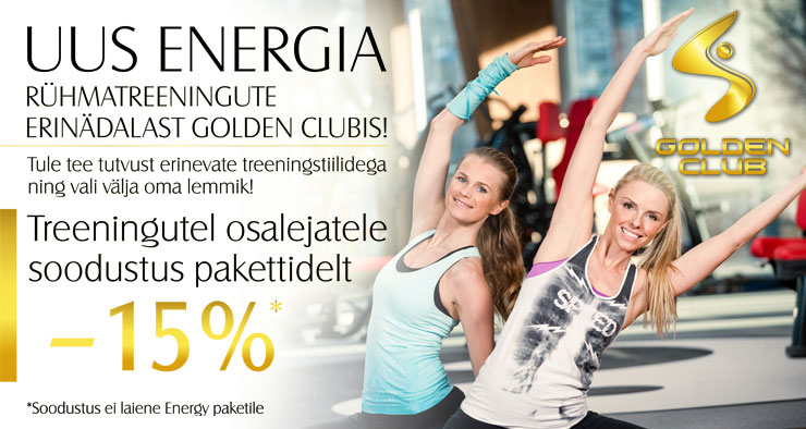 Kõigile, kes osalevad rühmatreeningute nädalal ja liituvad Golden Clubiga soodustus pakettidelt -15% (soodustus ei laiene Energy paketile).