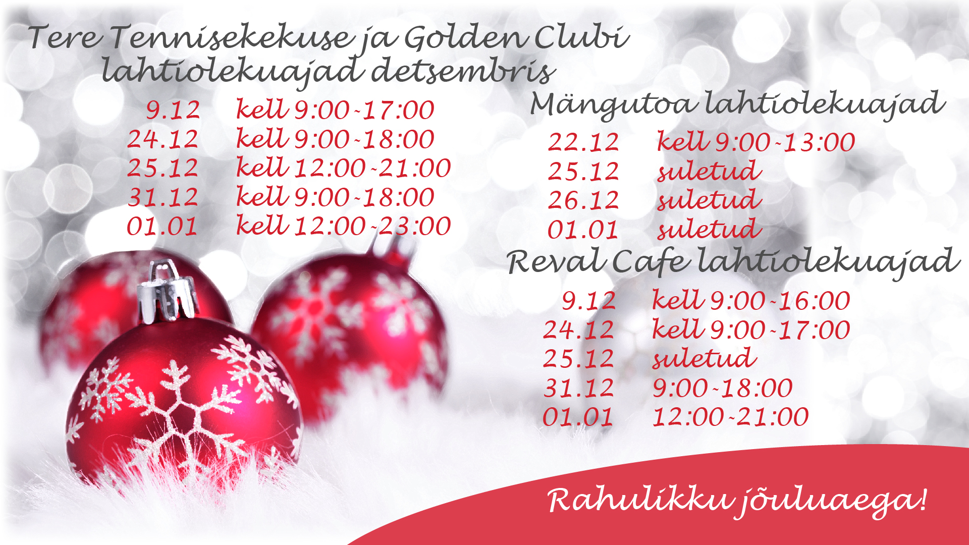 Tähelepanu! Golden Club ja Tere Tennisekeskus on laupäeval, 9. detsembril avatud kuni 17:00. Tutvu ka pühadeperioodi lahtiolekuaegadega!