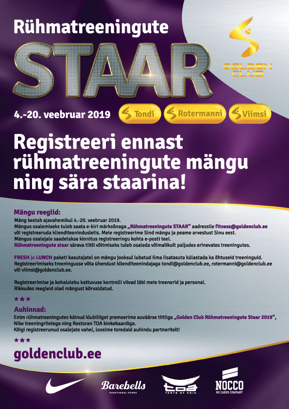 Mängus osalemiseks kirjuta oma soovist aadressile fitness@goldenclub.ee või registreeri end oma klubi klienditeenindusletis. Arvestus käib iga klubi lõikes eraldi, seega on võrsumas 3 Rühmatreeningute Staari!