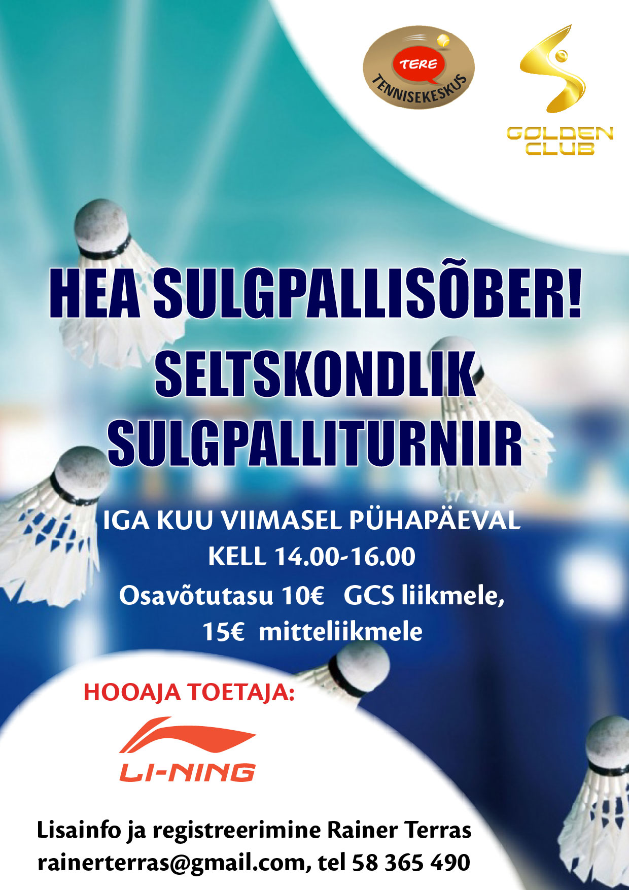 Seltskondlik sulgpall 5. märtsil 21.02.2017 Hea sulgpallisõber! Veebruari lõpu seltskondlik sulgpalliturniir nihkub nädala võrra edasi, 5. märtsile. Oled väga oodatud. Regamine ikka Rainer Terras.