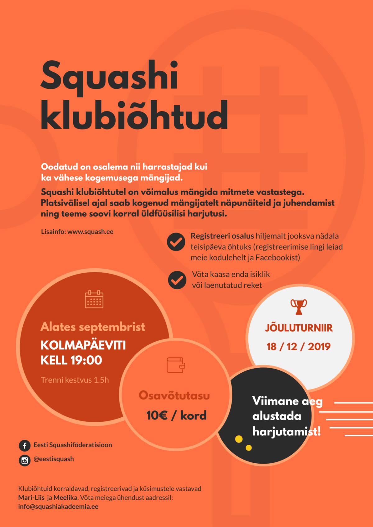 Squashi klubiõhtud kolmapäeviti kell 19:00