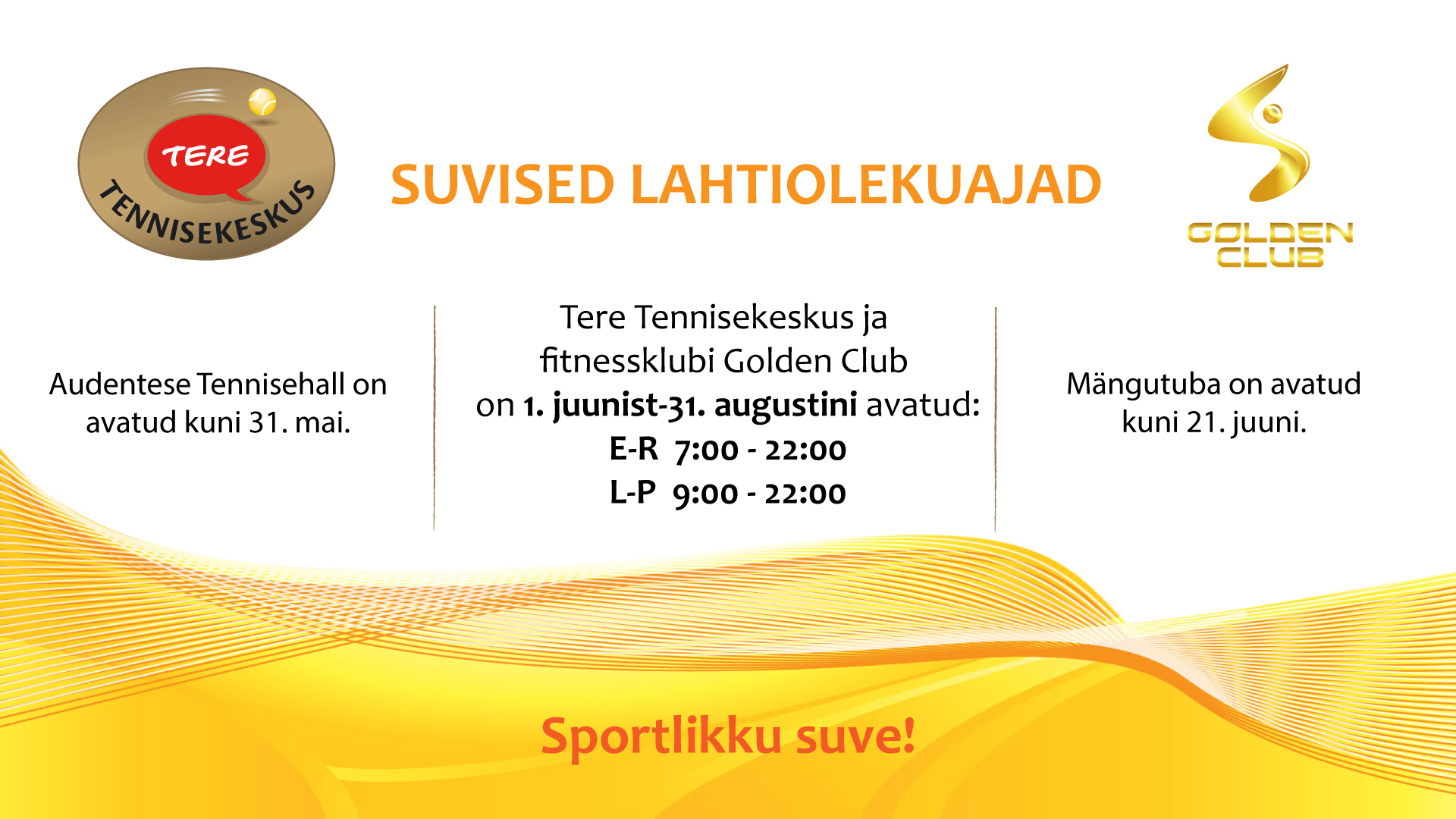 30.05.2018Suvised treeningud kolivad ilusate ilmadega üha rohkem välitingimustesse ning sellest tulenevalt muutuvad veidi ka Tere Tennisekeskuse ja fitnessklubi Golden Club lahtiolekuajad Tondil.