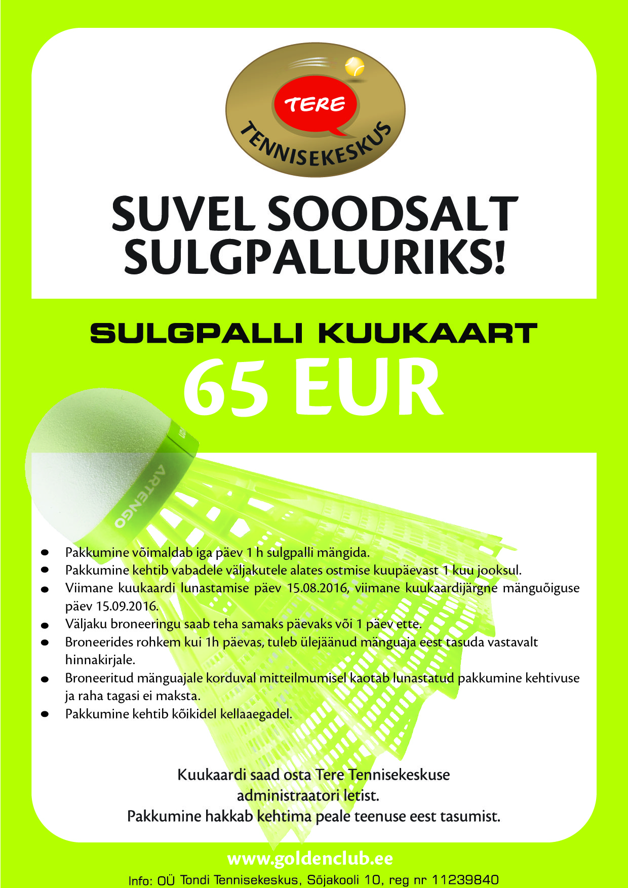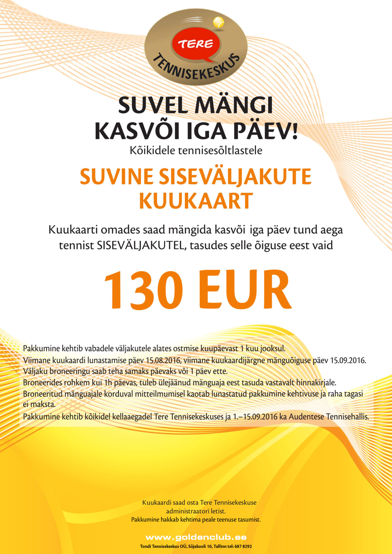 Taas müügil suvised kuukaardid nii tennise- kui sulgpallisõbrale 26.05.2016 Hea keskuse külastaja! Suvel on eriti soodne siseväljakutel treenida, kui soetad omale KUUKAARDI. Loe tingimusi allolevatelt plakatitelt ja soorita ost juba täna!