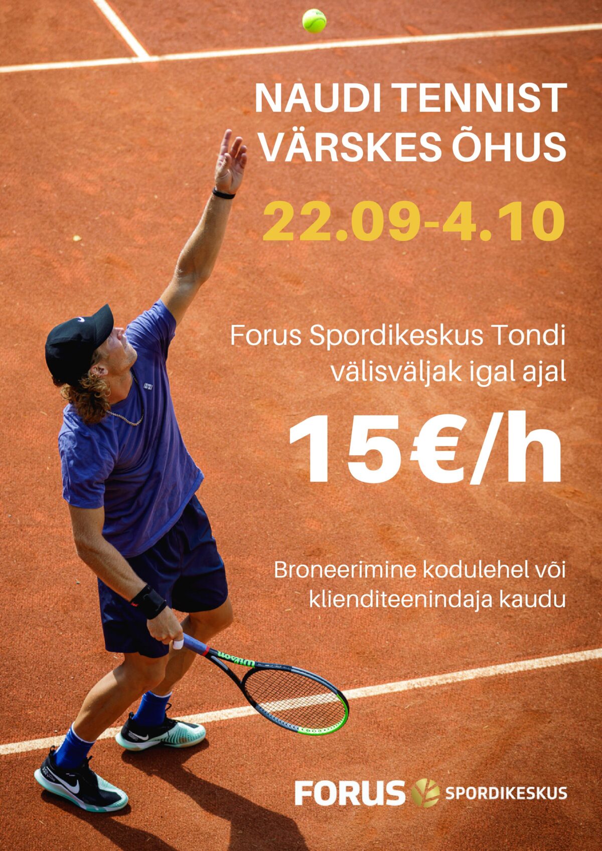 Perioodil 22.09-4.10, mil Tondi siseväljakuid rahvusvahelise tenniseturniiri tõttu kasutada ei saa, on Tondi välisväljakud müügis 15 eur/h sõltumata ajast. Sel perioodil riietusruume ja pesemisvõimalusi ei ole, aga värskes õhus tennist mängima oled väga oodatud.