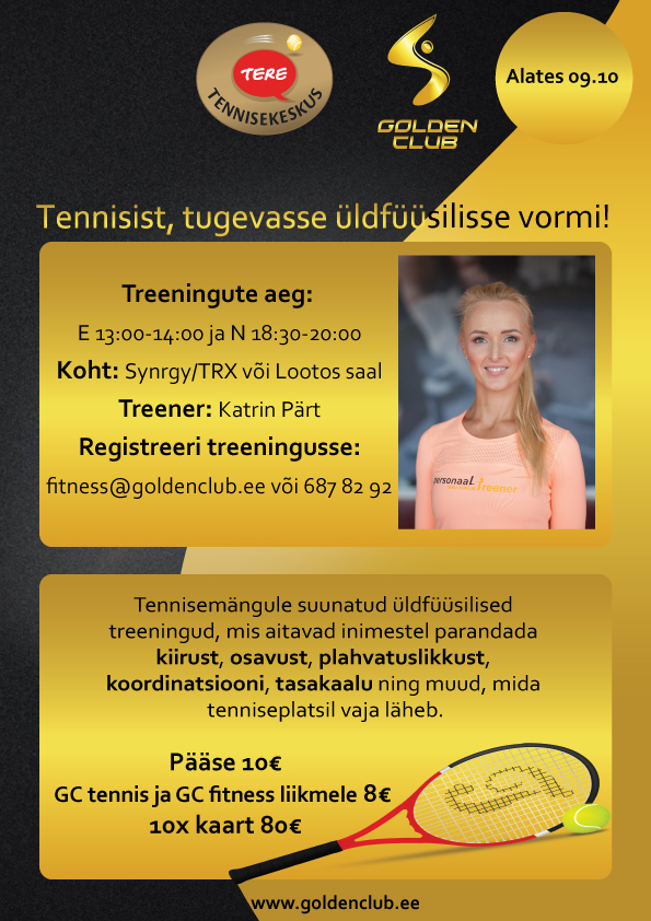 Alates 9. oktoobrist hakkavad fitnessklubis Golden Club kahel korral nädalas toimuma tenniseharrastaja üldkehalist vormi parandavad treeningud, mida viib läbi pikaajalise personaaltreenerina töötamise kogemusega harrastustennisist Katrin Pärt.