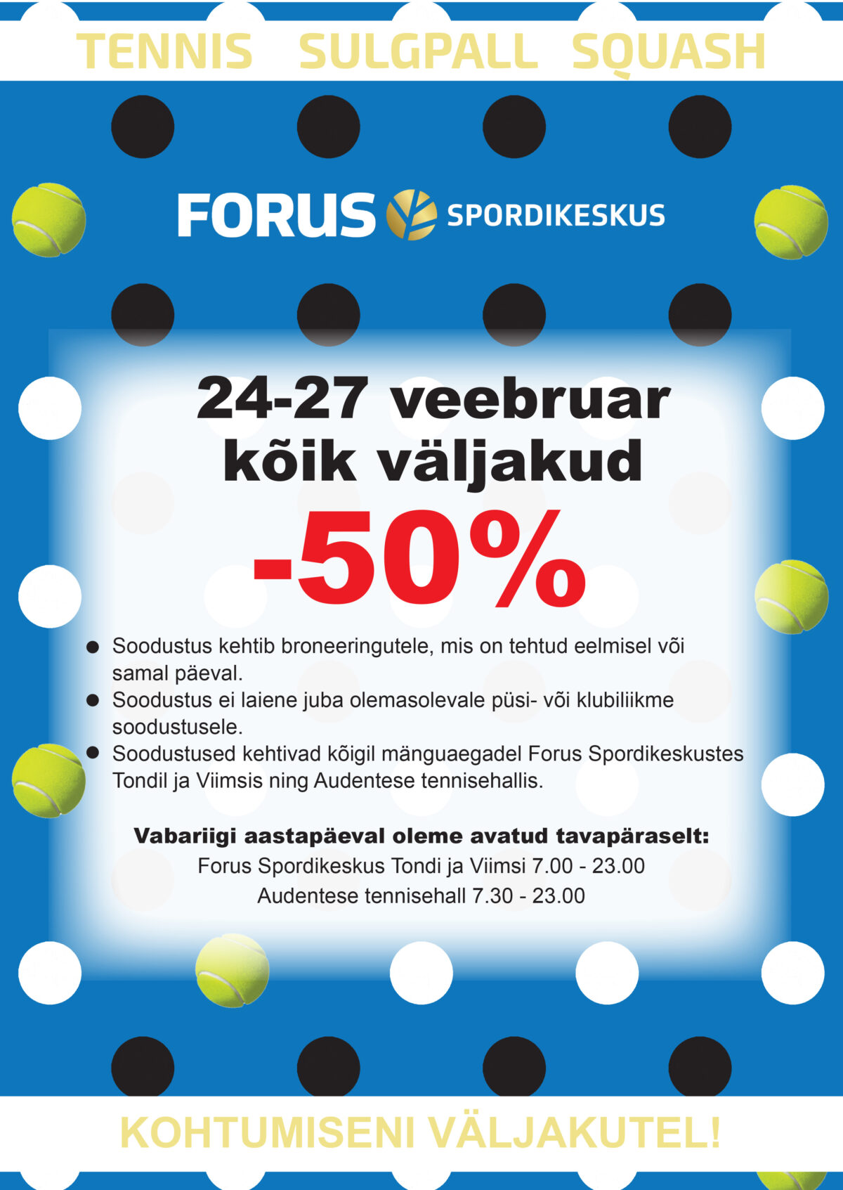 - Soodustus kehtib kõigil mänguaegadel Forus Spordikeskustes Tondil ja Viimsis ning Audentese tennisehallis.